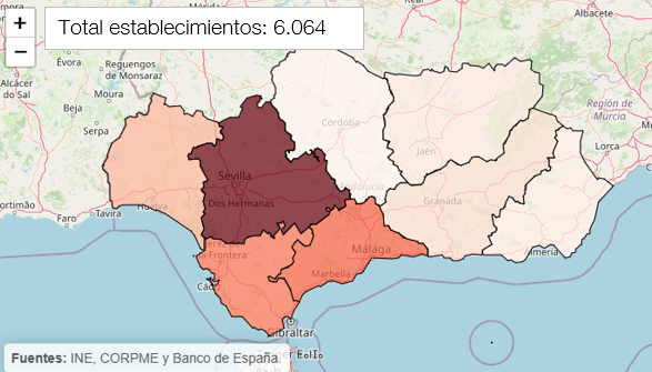 El nuevo visualizador ViME permite acceder a estos datos a nivel provincial y realizar análisis comparativos: Por ejemplo, podemos observar en los mapas anexos cómo la distinta especialización productiva genera diferencias en la concentración de activos y ventas de los establecimientos de empresas madrileñas entre las diferentes provincias de la Comunidad Autónoma de Andalucía.